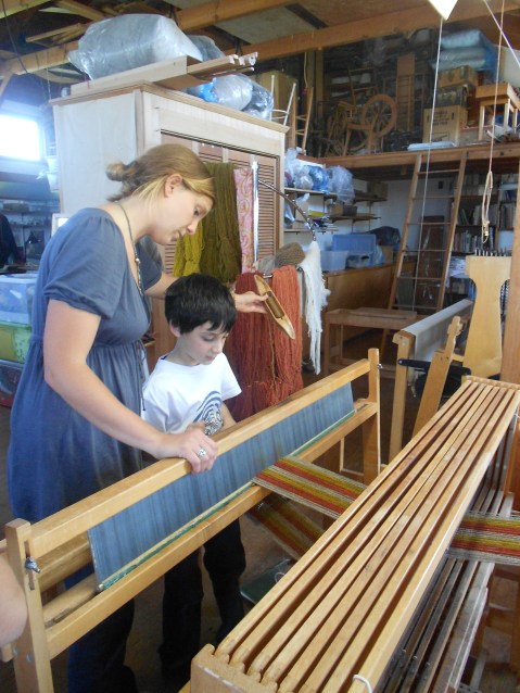 Then, in the weaver’s studio, my son got to try his hand at a loom, using wool that was dyed by an apprentice, the same young woman who brings us our week’s worth of vegetables. Thank you, East Hill Farm farmers. It’s been a great summer.