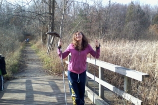 My daughter brings her poles along for the 2 mile hike, just to get a feel for them. Then, out of nowhere, my daughter wants me to give them a try. I listen to her and slip my thumb in the proper hole, adjust the velcro secure around the rest of my hand. Bend my elbows just so. And, in one final hike before the snows fall, my daughter and I take turns with the poles along the trail. Together. Side by side.