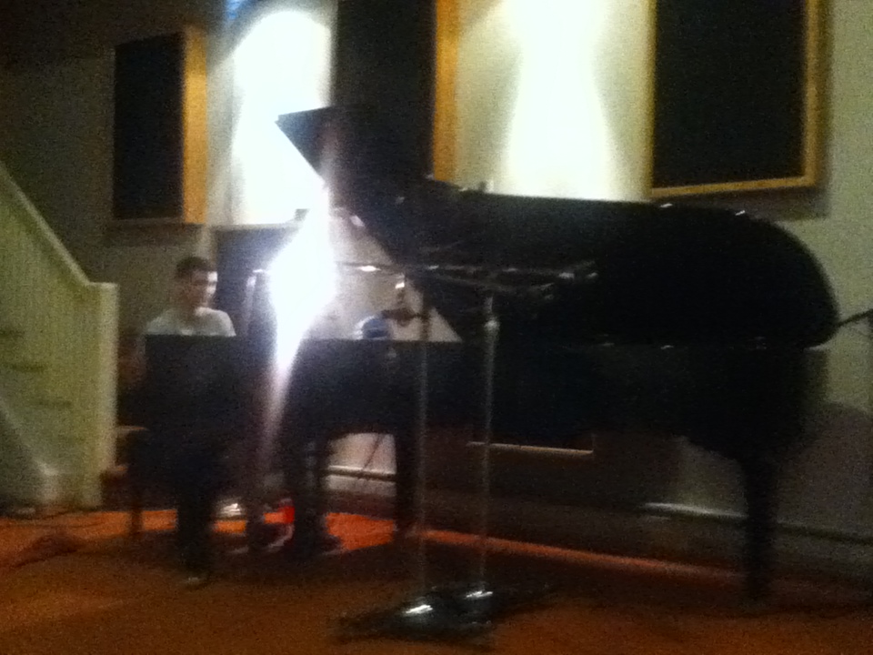 Then, after we grew tired of standing and the blaring horn section (and, frankly, it was the guy smoking a cigar who did me in)For a complete change of pace, when we had enough of the crowds, we ducked into an alleyway and discovered Blackdog Recording studios, where we were invited in down two flights of stairs treated to a free private concert by local pianist Mike Vadala: