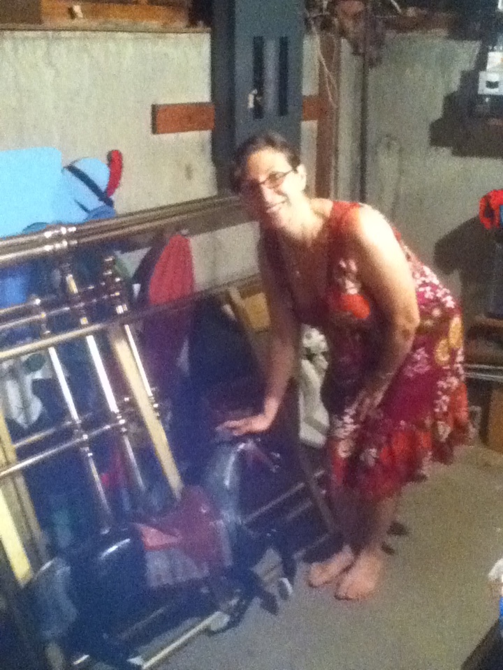 my sister-in-law petting a carousel pony, that’s smurfette I think behind the bars of an old brass bed.