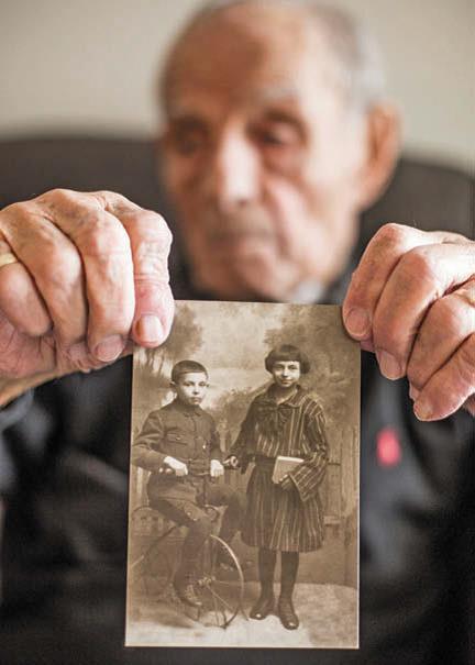 Upfall, holding a photo of himself and his sister, who perished in Auschwitz