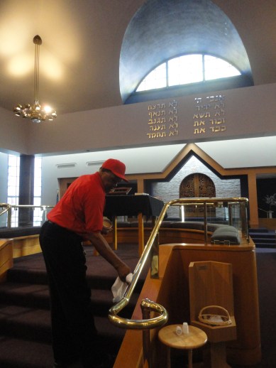 Murphy Ealy shines the brass on the bimah at Congregation Beth Ahm.