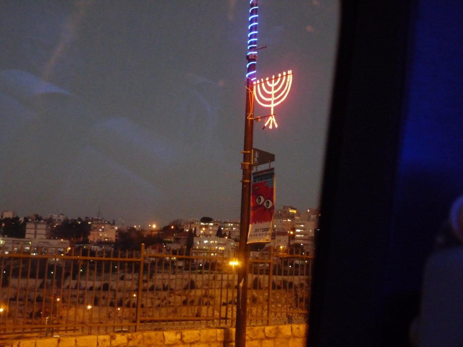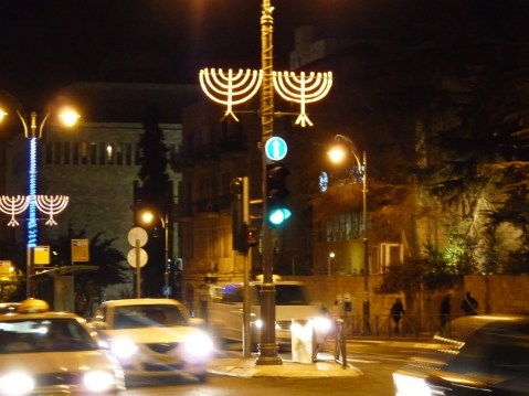 Chanukkah is big, as every corner on every street is decorated with Chanukkiot. No, not menorahs. A menorah is the seven-branched candelabra, and though it is the symbol of Israel, the chanukkia, the nine-branched candelabra, is for chanukkah: