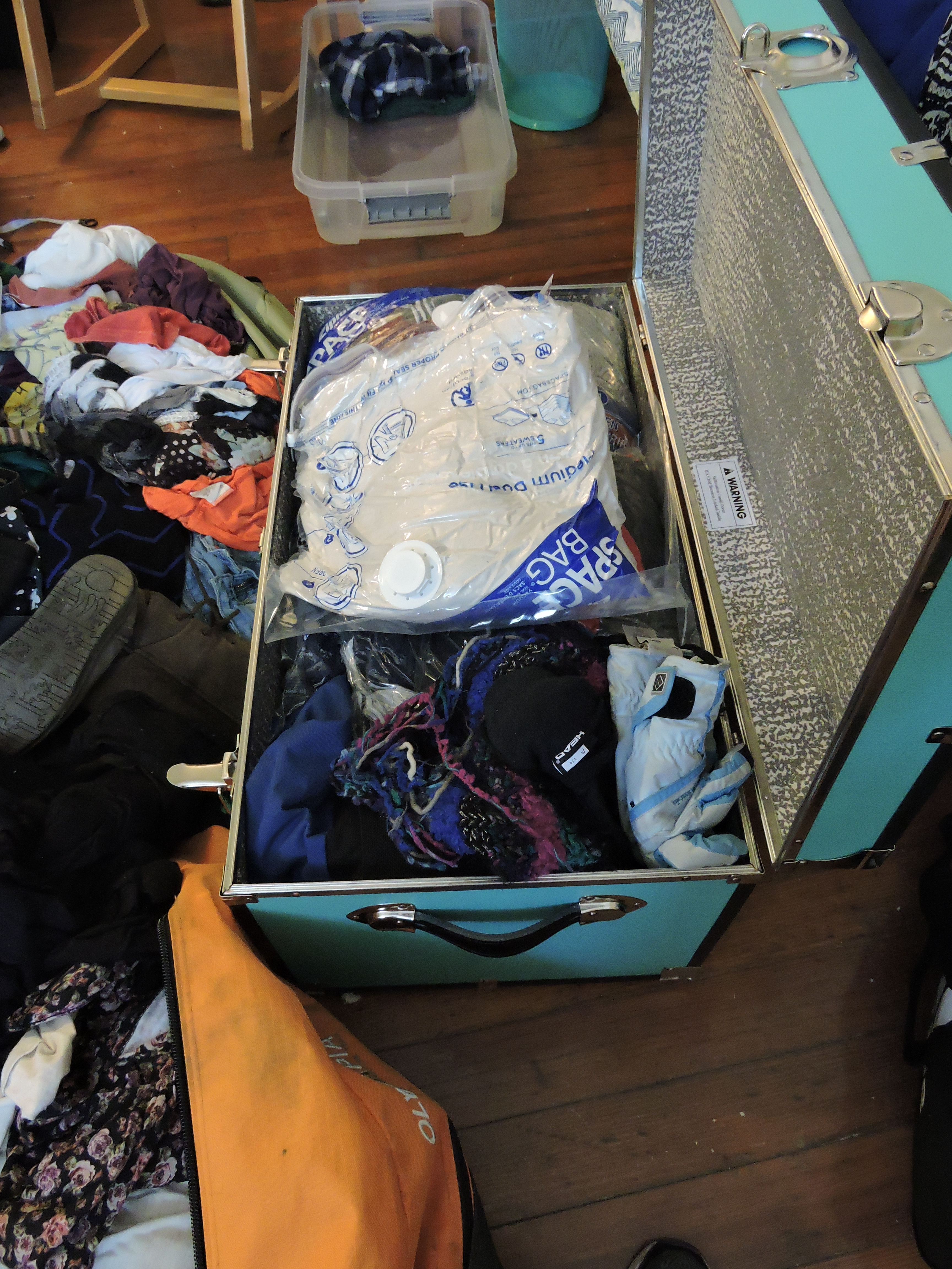 See? With five of these bags I was able to squish several coats and a winter’s worth of sweaters into her “basement” – really a trunk that is stored under the bed.