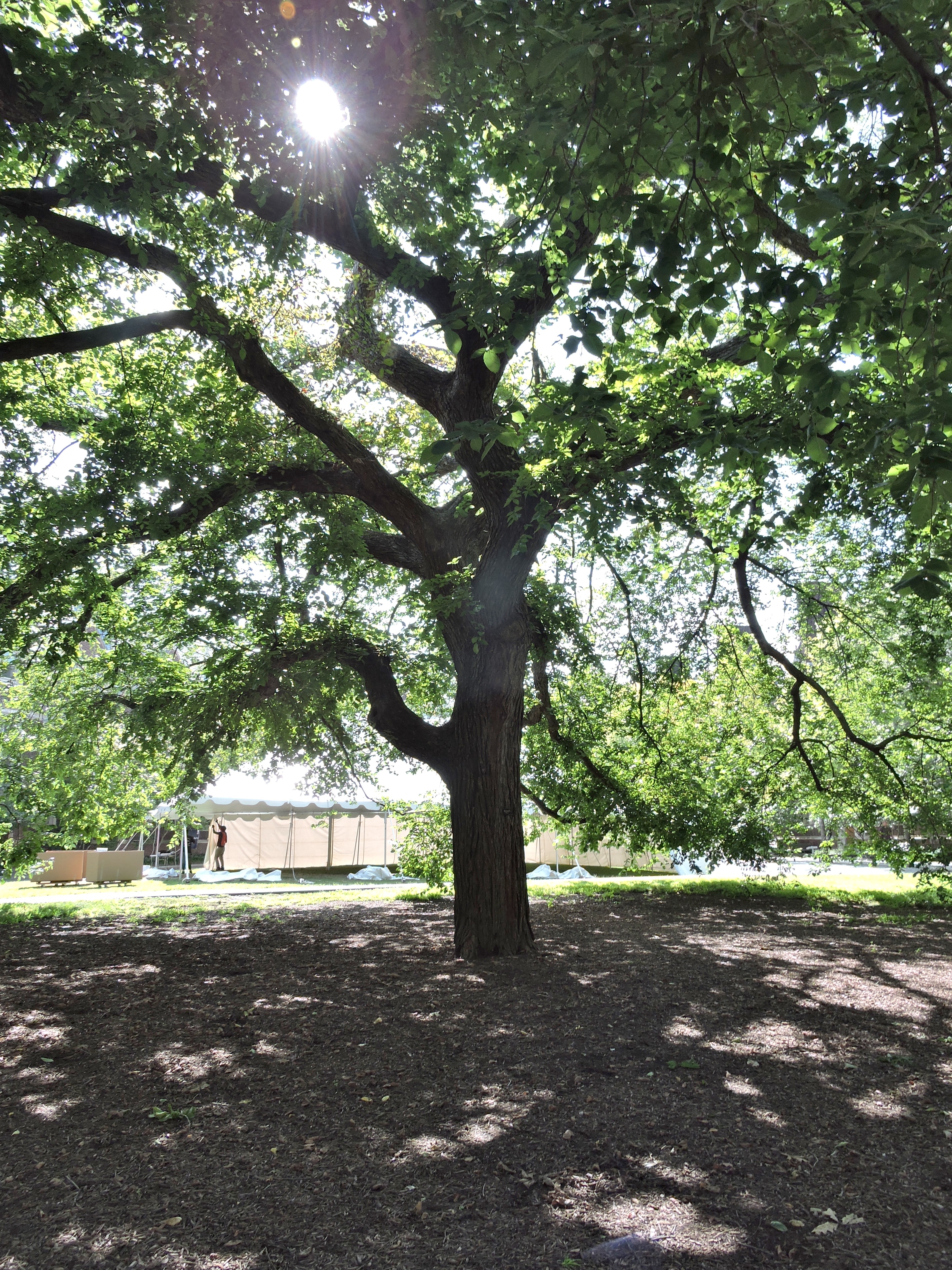 Her quad is peaceful and serene, lined with Ivy-clad dormitories, benches, gardens, statues and graced with an old dorm room beset with a marble and concrete facade in a quadrangle of other old buildings graced with Ivy and a centuries-old Elm tree providing shade for studying, or just a good nap,