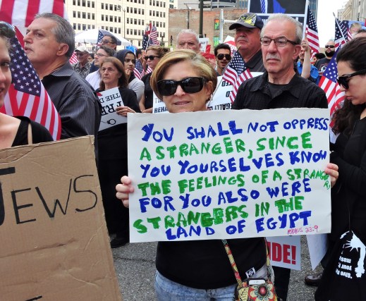 Lori Lutz of Bloomfield township came to the rally with Detroit Jews for Justice and held up a sign bearing a quote from Exodus about the commandment to “remember the stranger.”